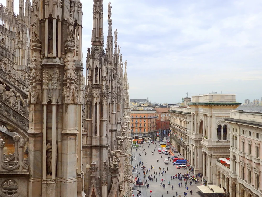 However, what many people don’t realize is that you can get some of the best views in all of Milan from high atop its terrace. From here you’ll enjoy incredible panoramic vistas. Also, you get a birds-eye view of people wandering about in the square below.