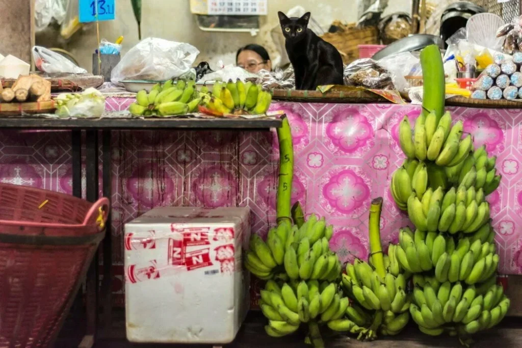 A four-leg guardian and a banana vendor make a great-synchronized couple at the market in Chiang Mai, Thailand: while one rests, the other takes care of the customers.