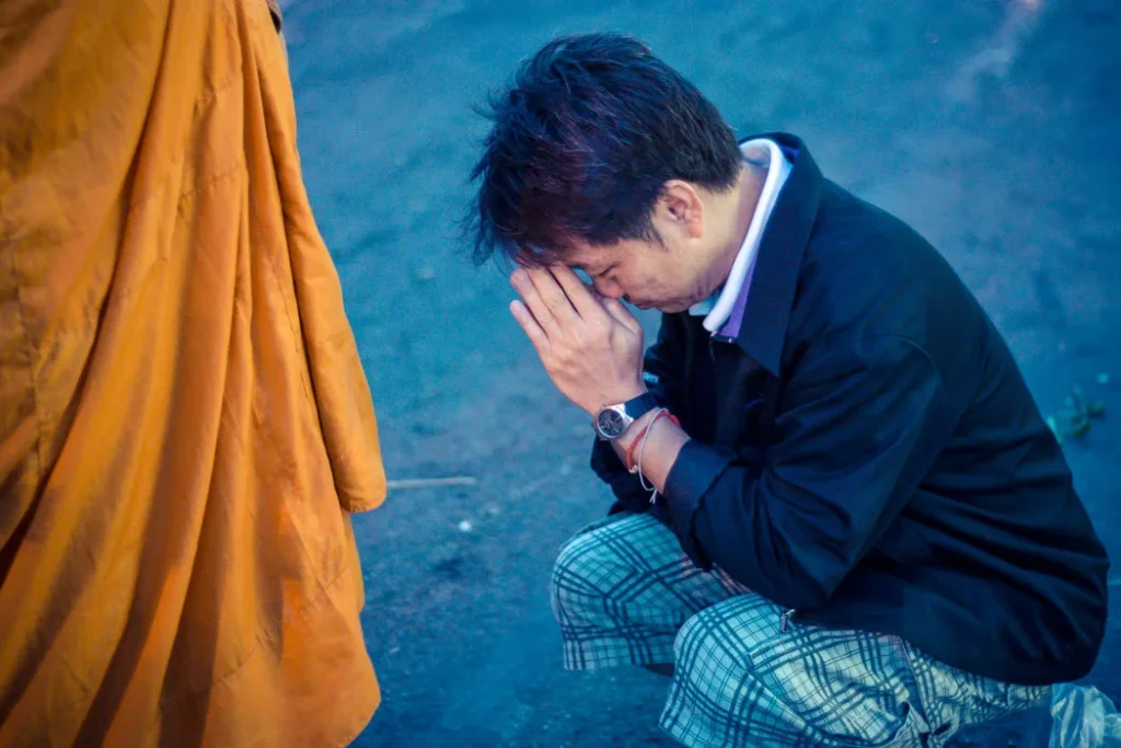A local deeply concentrated in his early morning prayer to a Buddhist monk during the alms giving ritual, on the streets of Chiang Mai, Thailand.