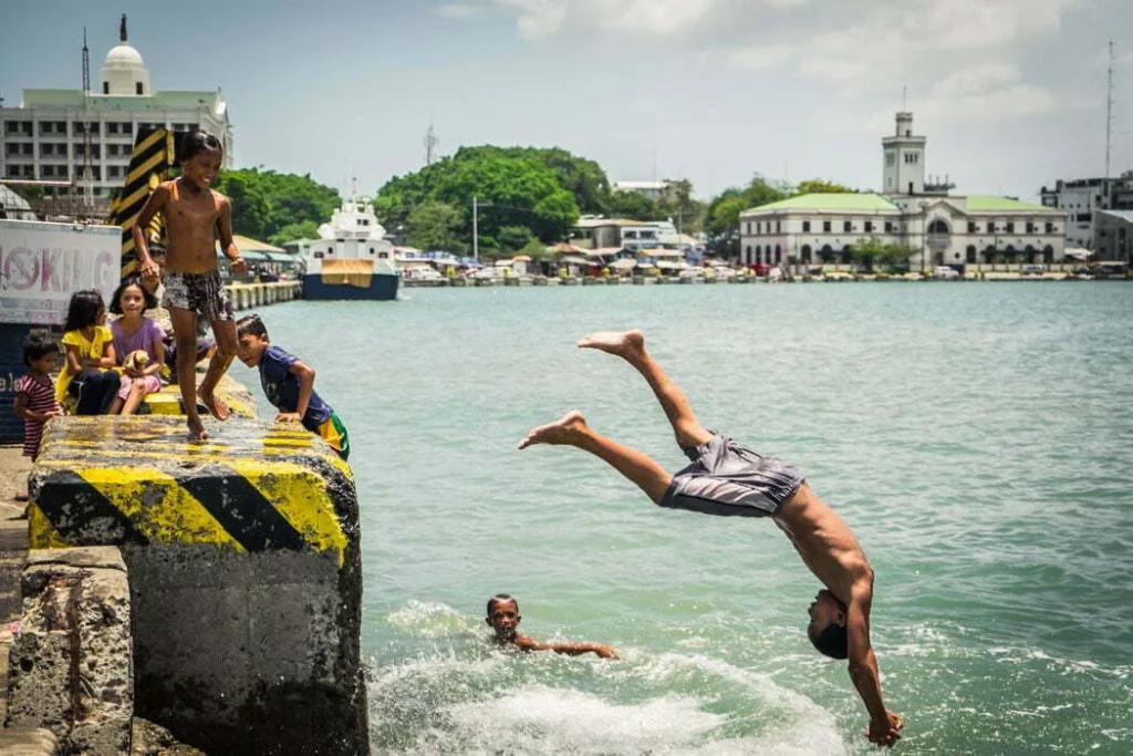 Filipino kids don’t need too much to have fun. These are jolly children at the port in Iloilo, Philippines on a hot sunny day.