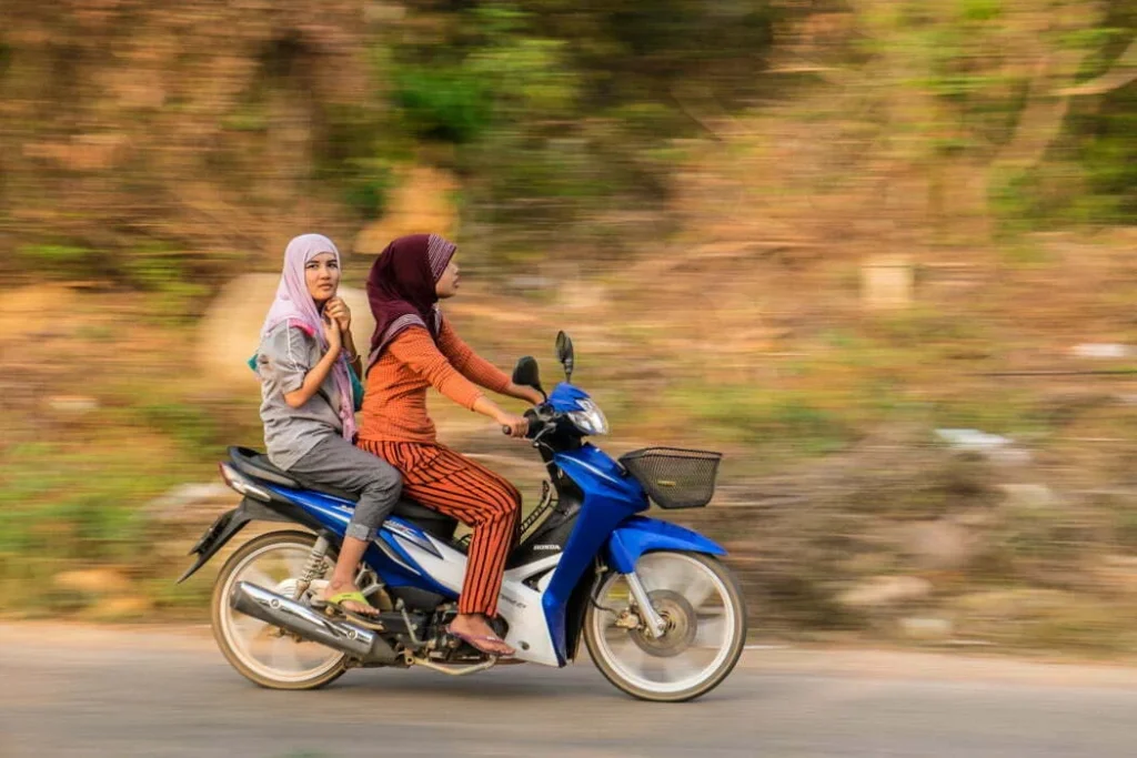 When the eye of a camera meets human eyes. Two young girls riding a scooter in the almost deserted southern tip of Koh Lanta, Thailand.