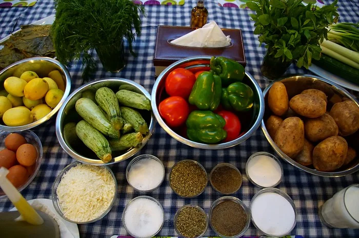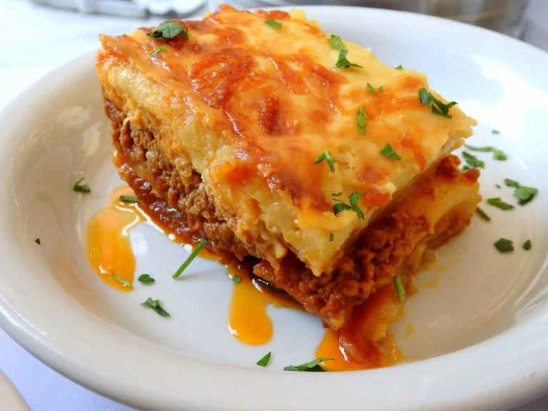 Moussaka, common throughout the Mediterranean region, is a layered dish consisting of béchamel sauce, minced meat, potatoes and eggplant.