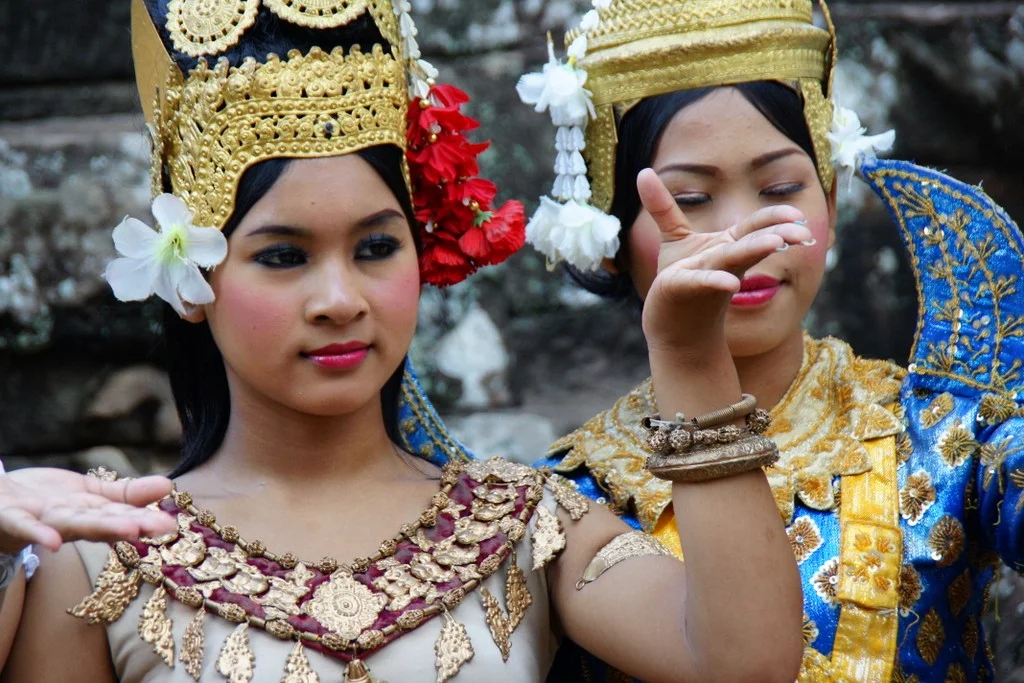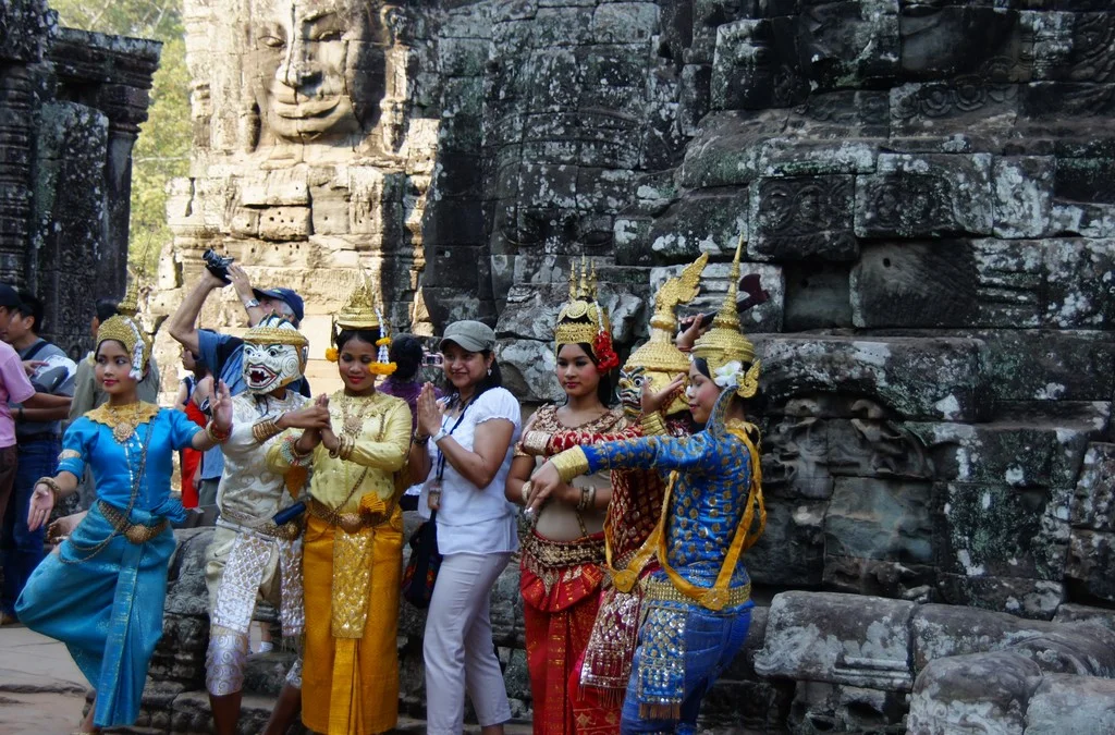 Traditional Khmer dances wearing elaborate costumes greet tourists at Bayon