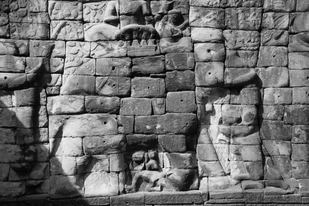 A low angle perspective shot of the bas-relief sculpture at Bayon, Angkor Thom.