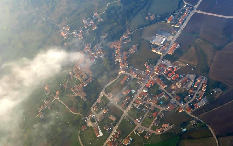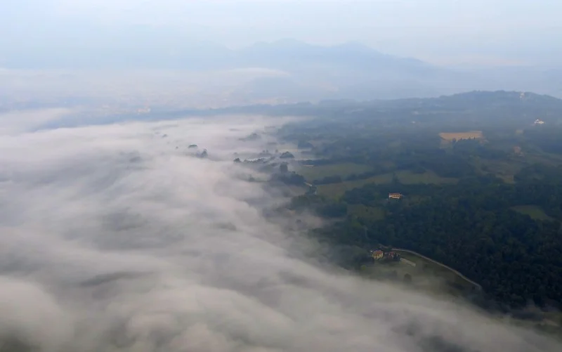 Clouds in the foreground and homes in the background during our hot air balloon ride in Costa Brava