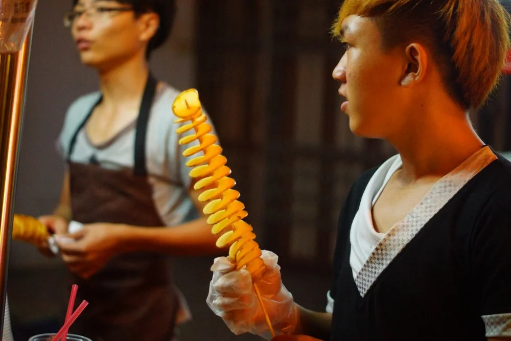 A street vendor prepares strips of potatoes on skewer that are known as tornado chips. I’ve had something very to this in South Korea.