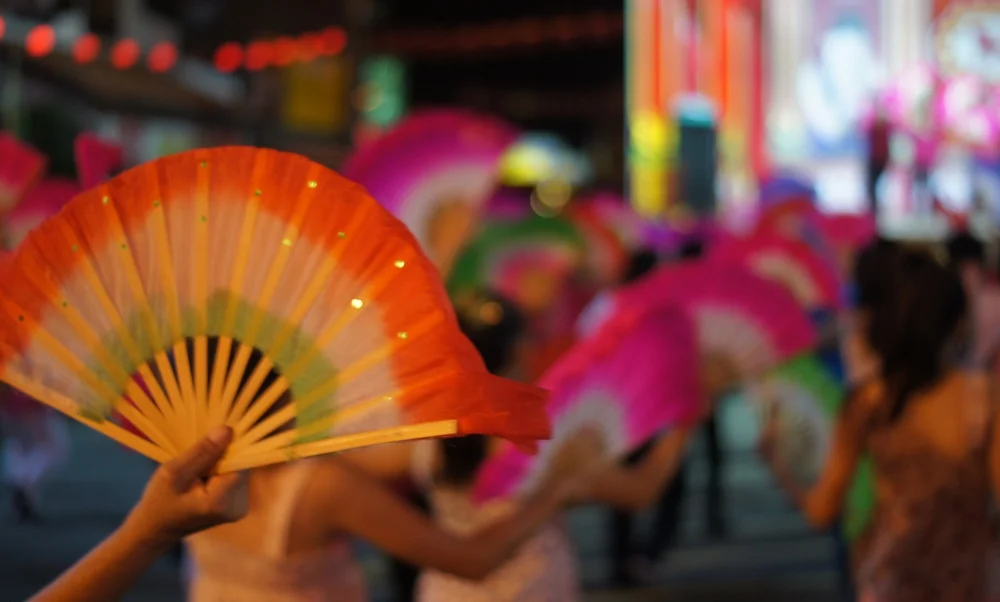 This is a close-up perspective shot of a fan dance being performed by a group of Chinese dancers.