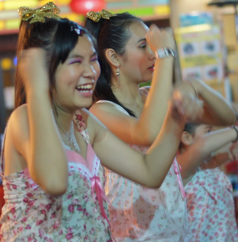 A candid shot of some girls laughing while performing a dance. These girls really were enjoying putting on a show.