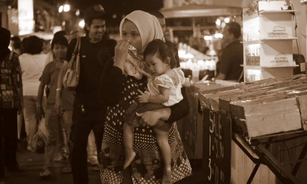Mother and daughter make their way down the ever hectic Jonker Street night market.