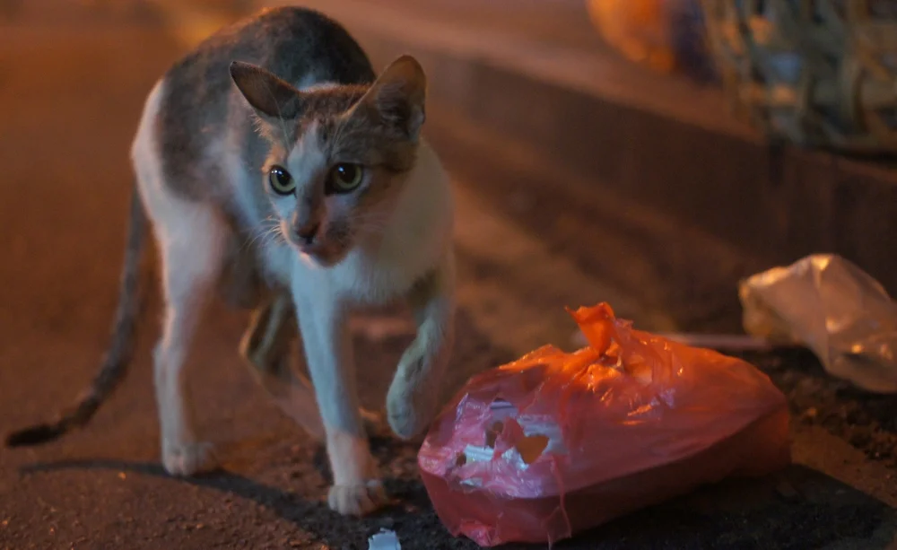 A cat scratches at a bag in search of a few scraps. If you visit Melacca you’ll notice plenty of critters roaming about.