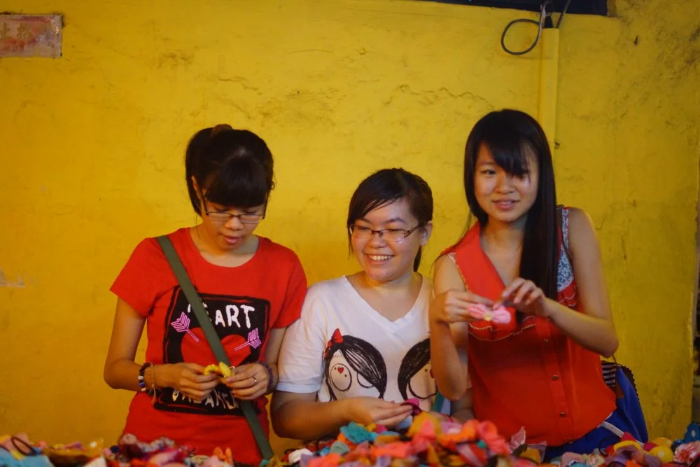 A group of ladies flash a candid smile while enjoying shopping at the night market for various kinds of trinkets.