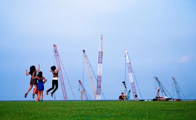“Girls jump for a photo with cranes in the background. This was taken on top of Marina Barrage.”