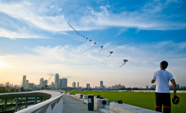 “On top of the Marina Barrage is a grass park where people are famous for flying kites.”