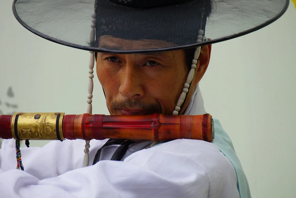 A Korean man wearing traditional attire plays a traditional instrument delighting passing pedestrians.