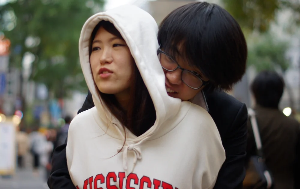 A Korean couple embrace with a hug on the street of Insadong – Seoul, South Korea.