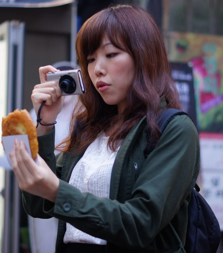 A lady takes a photo of the street food she has just bought by extending her left arm and holding her point and shoot in the other.