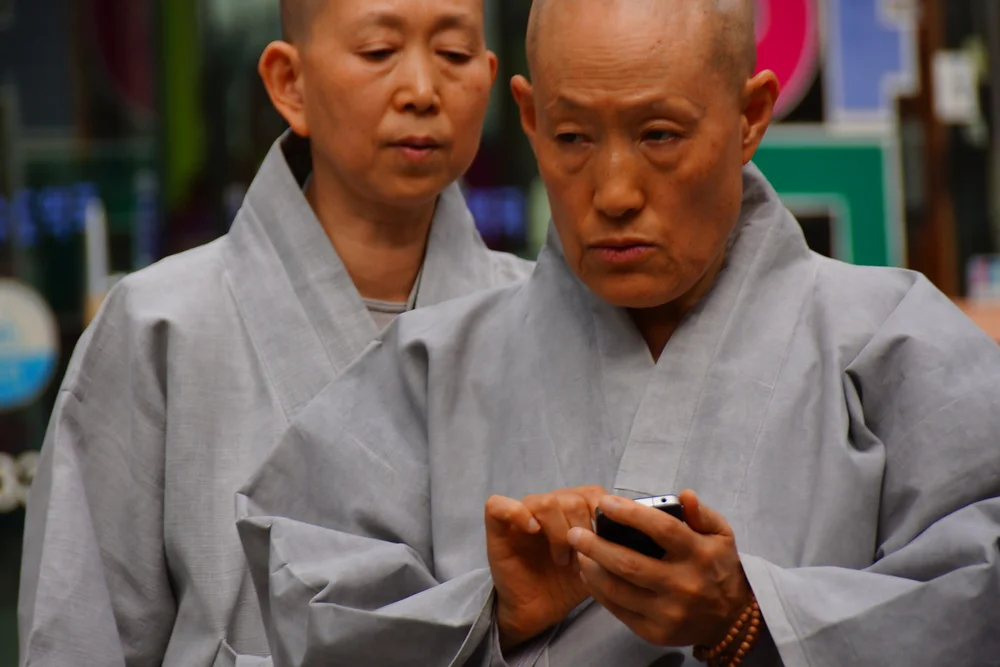 A Korean monk wearing a grey robe texts into messages using his cellphone. I’m at surprised at how many monks I can see in Insadong.