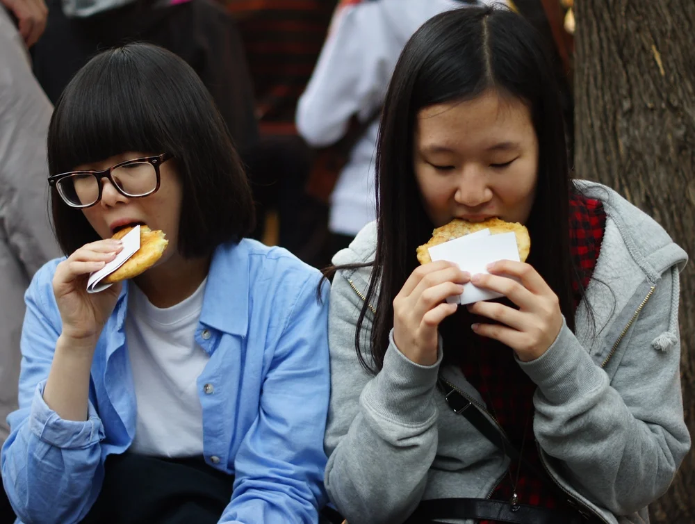 Two Korean girls enjoy hotteok 호떡(Korean style pancake filled with brown sugar, peanuts, cinnamon & honey) in Insadong, Korea.
