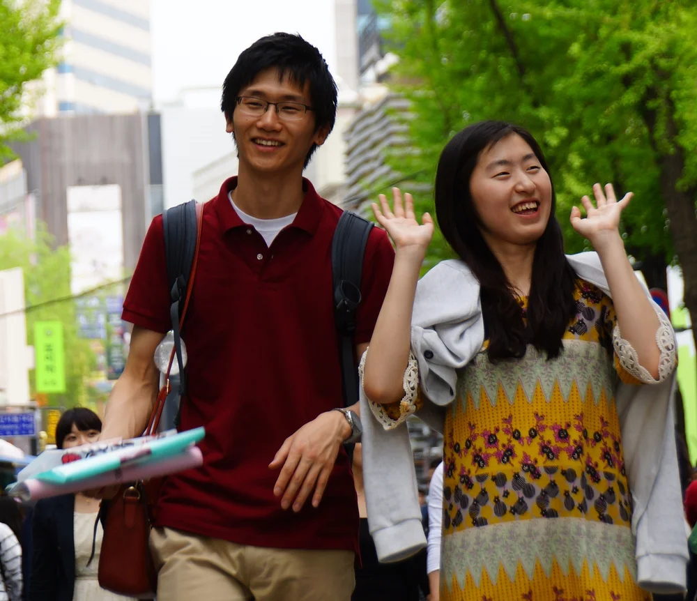 An animated Korean couple share a candid moment on the streets of Seoul, Korea.