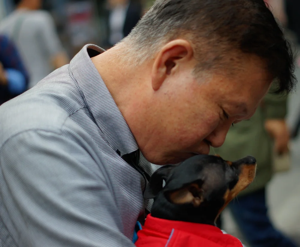 This Korean man shares a cute moment with his dog – dressed in a warm suit – as he tenderly kisses the top of its head.