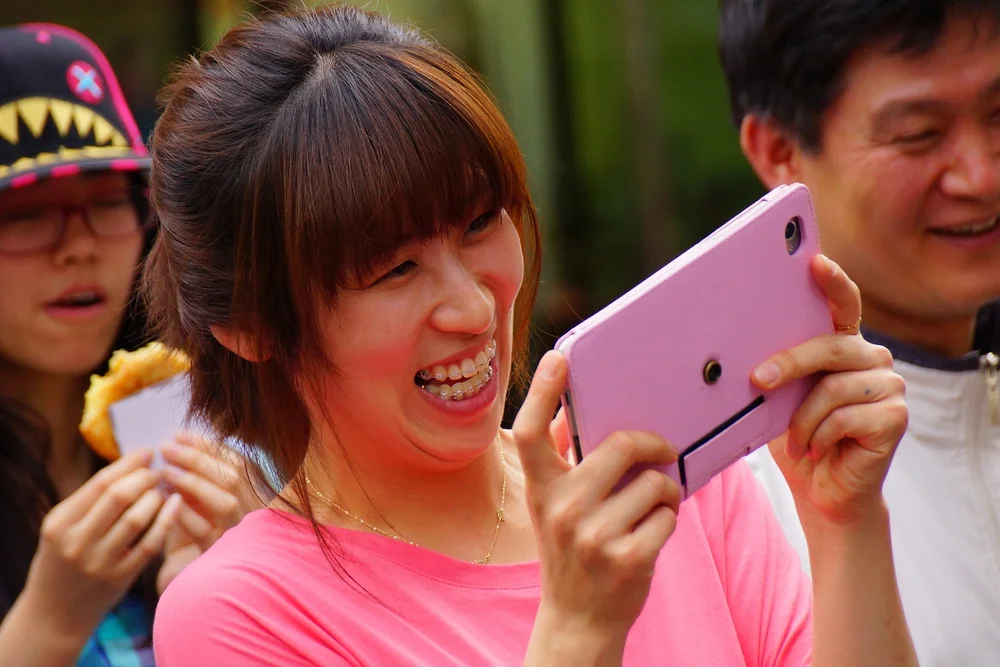 A Korean lady flashes an enormous smiling face while enjoying snapping a photo with her large pink tablet. I still find it a bit strange when seeing people taking photos with these kind of tablets – Insadong, Seoul, Korea.