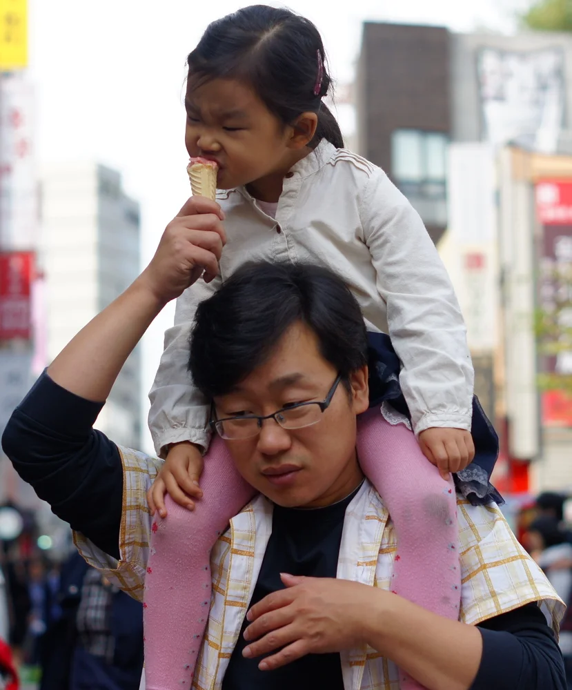 This adorable Korean girls takes a bite out of her ice cream as she’s being carried piggyback by her father in what is a very cute moment.