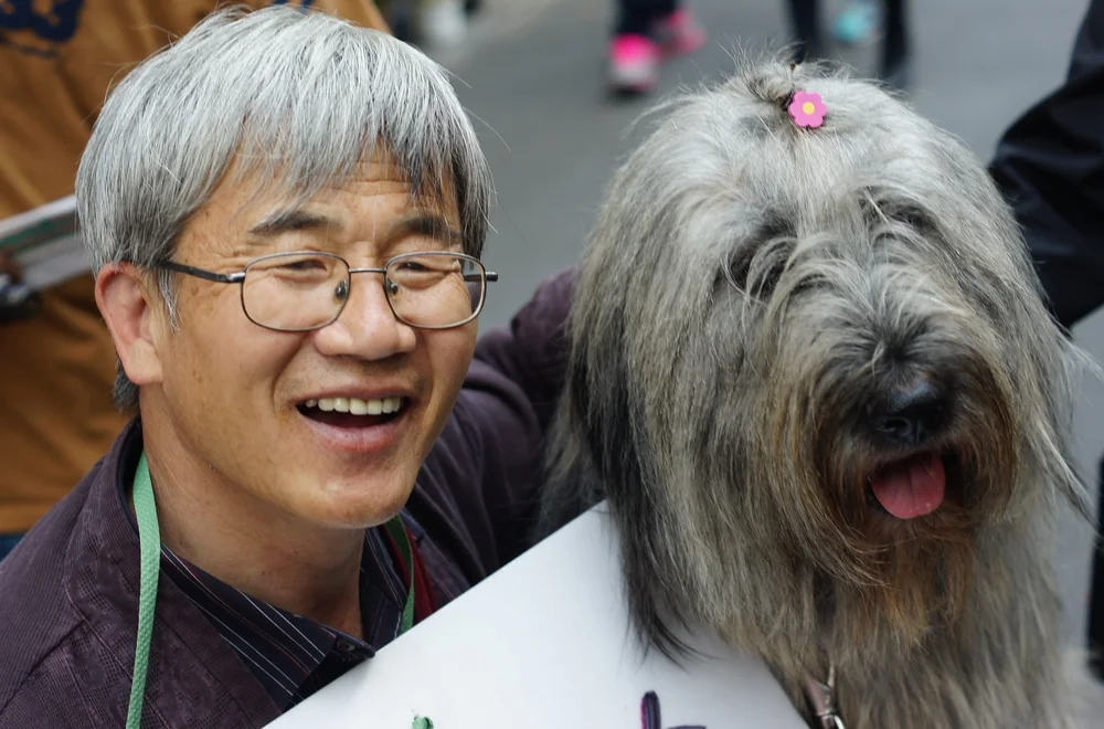 A Korean man wearing glasses and a big grin hugs his dog in Insadong, Seoul, South Korea.