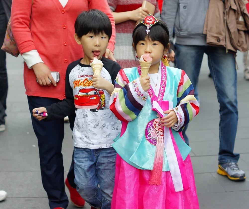 A small Korean boy and girl dressed in traditional attire enjoy a refreshing bite of an ice cream cone.