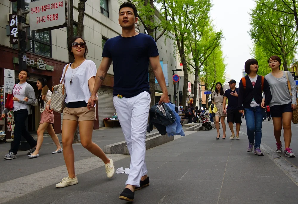 A fit looking Korean couple confidently strut their stuff down Insadong as though it were a catwalk 😛